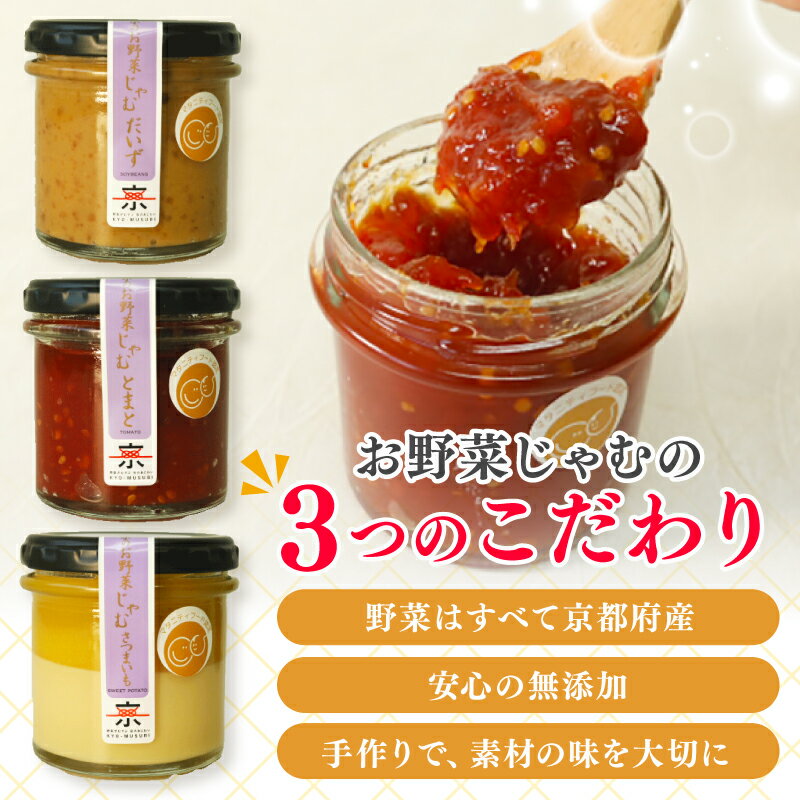 - 【ふるさと納税】 京のお野菜じゃむ 3個セット ジャム ( 野菜ジャム 野菜 京野菜 大豆 トマト さつまいも 食べ比べ 詰め合わせ セット 無添加 加工品 瓶詰め 子ども 赤ちゃん 乳幼児 離乳食 マタニティフード ギフト 贈答用 プレゼント 南丹市 京都 京都府 )