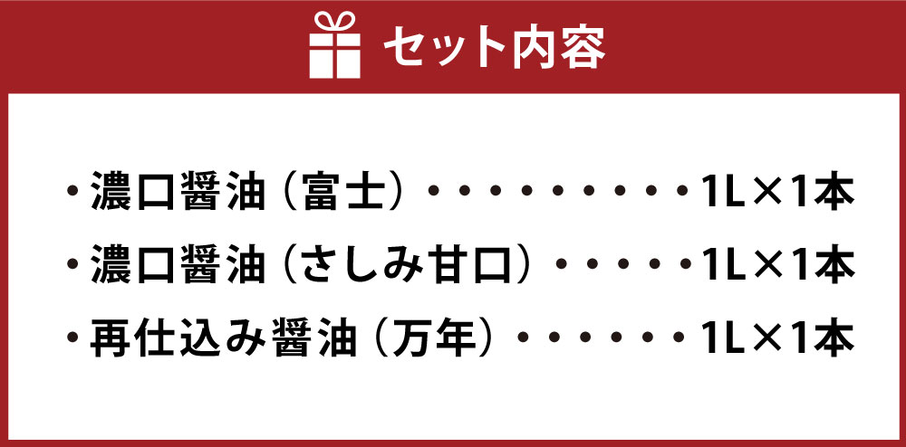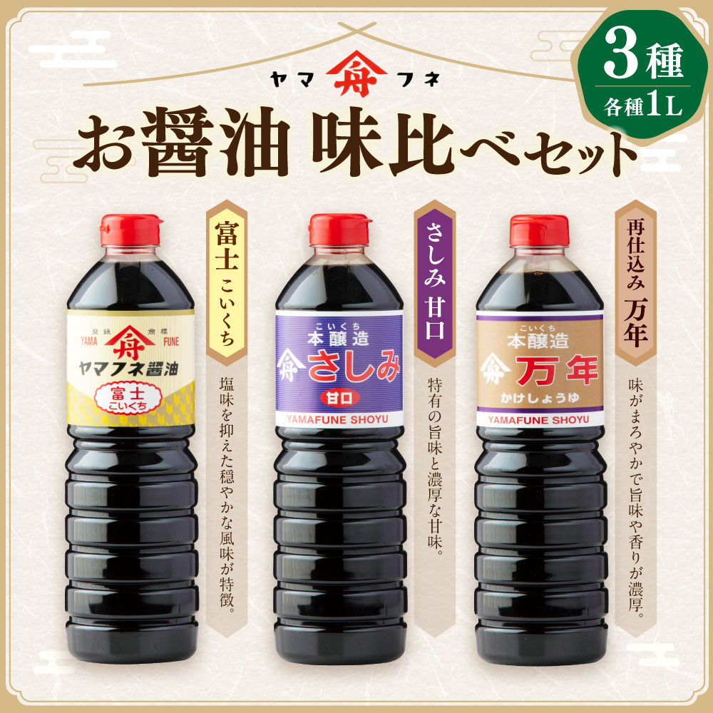 - 【ふるさと納税】お醤油 3種 味比べセット 濃口醤油(富士・さしみ甘口)・再仕込み醤油(万年) 計3L(1L×3本) 各1L しょうゆ 甘口醤油 さしみ醤油 かけ醤油 たまごかけご飯 刺身 寿司 豆腐等かけ醤油 漬物 焼き肉 煮物 調味料 大分県産 国産 大分県 九重町 送料無料
