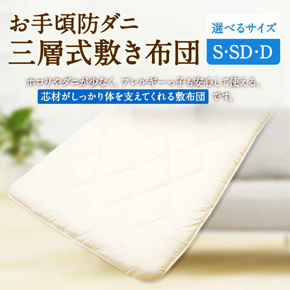 - 【ふるさと納税】<選べるサイズ>お手頃防ダニ 三層式敷き布団 シングル・セミダブル・ダブルサイズ 側生地:綿100% 中綿 :高機能ポリエステル100% しきぶどん ふどん 敷布団 ダニ対策 アレルギー 寝具 日本製 国産 福岡県 みやま市 送料無料 S80 S81 S82