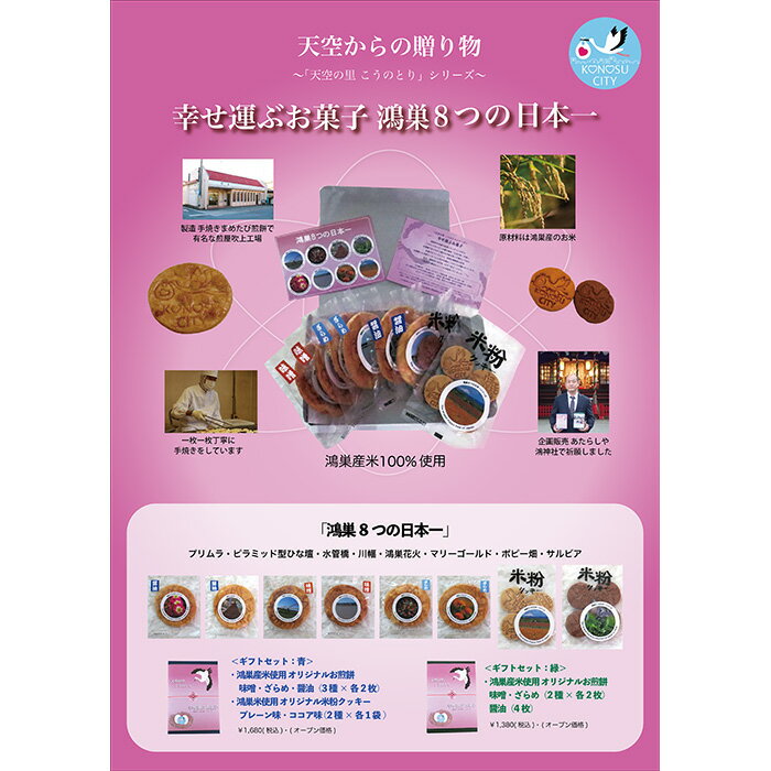 - 【ふるさと納税】天空の里こうのとり・幸せを運ぶお菓子手焼き煎餅 米粉クッキーセット[No.562] / おやつ お菓子 菓子 せんべい しょうゆ 醤油 ざらめ ザラメ 砂糖 みそ ミソ 味噌 こめこ ココア バター 鴻巣市産米使用 ソウルフード 鴻神社ご祈祷 送料無料 埼玉県