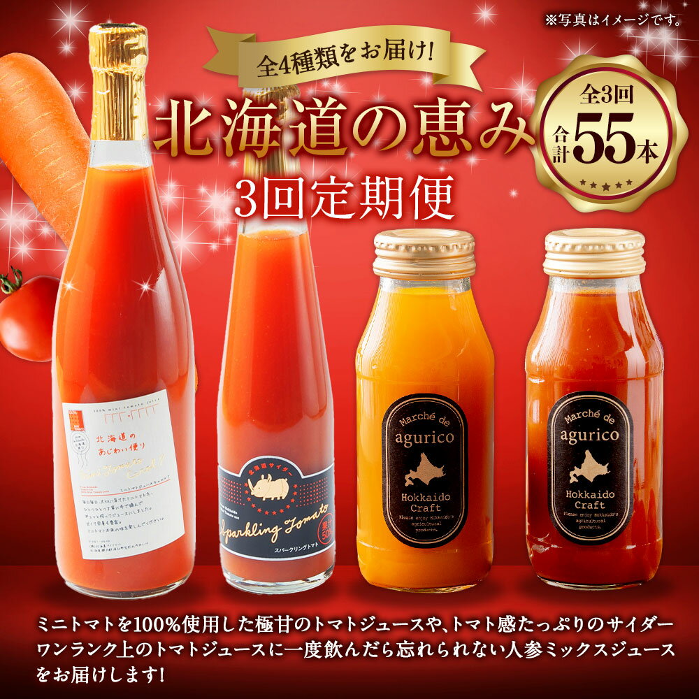 - 【ふるさと納税】【3回定期便】 北海道の恵み 定期便 ミニトマト ジュース 720ml×4本 スパークリング トマト 300ml×3本 計3.78L 計7本 / ミニトマト ジュース 無塩 180ml×24本 計4.32L / 人参ミックスジュース 180ml×24本 計4.32L 4種 飲料 野菜 【浦臼町】 送料無料