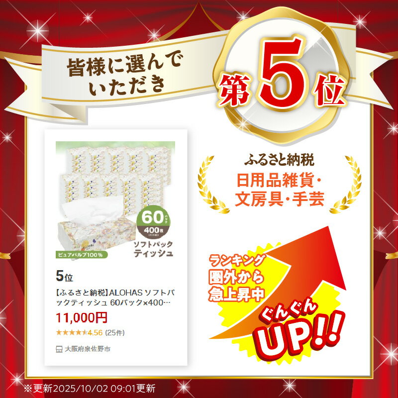 - 【ふるさと納税】ALOHAS ソフトパックティッシュ 60パック×400枚 200組 省資源 分別不要 コンパクト設計 柔らか パッケージ 持ち運び 便利 生活用品 雑貨 日用品 必需品 紙 常備品 備蓄 防災グッズ 発送月 大阪府 泉佐野市 オリジナル 送料無料