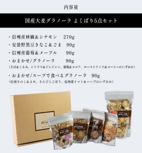 - 国産大麦 グラノーラ 「 gran*nola (グラン*ノーラ) 」 よくばり5個セット | ドライフルーツ りんご ぶどう くるみ 大豆 きのこ ごぼう トマト ハーブ 信州産 長野県