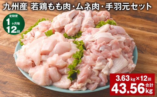 【1ヶ月毎12回定期便】 九州産 若鶏もも肉・ムネ肉・手羽元セット 計約43.56kg(約3.63kg×12回) 鶏肉 もも肉 ムネ肉 手羽元【お申込み翌月から出荷】