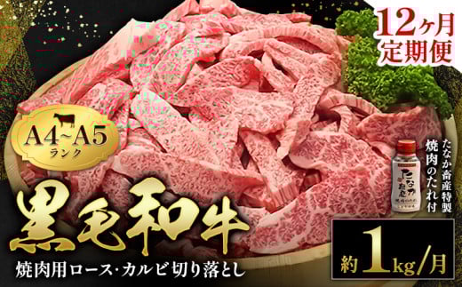 - 黒毛和牛 焼肉 ロース カルビ 切り落とし 1kg A4 ~ A5 ランク 12ヶ月定期便 《お申し込み月の翌月から出荷開始》ランプ ミスジ イチボ 特上 ミシュラン 国産 肉 牛肉 黒牛 天草 苓北 熊本 産地直送 送料無料