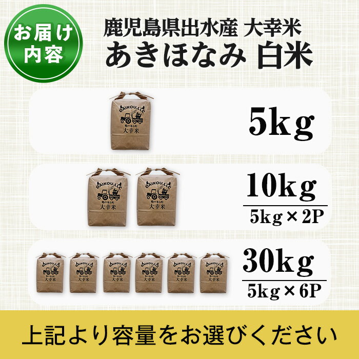 - 【ふるさと納税】<2025年10月下旬~11月中旬までに発送予定>《選べる容量!数量限定》鹿児島県出水市産 大幸米 あきほなみ(白米)<5~30kg> 米 5kg 10kg 30kg あきほなみ 鹿児島 5キロ 10キロ 30キロ お米 おにぎり ごはん 【大幸】