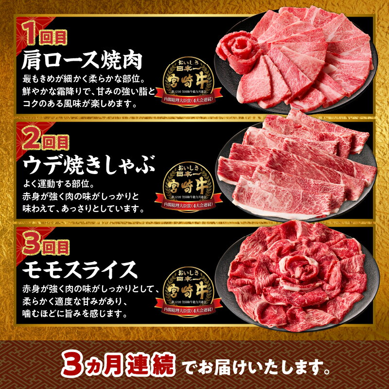 - 【ふるさと納税】【3ヶ月定期便】宮崎牛霜降り焼肉・赤身スライス焼きしゃぶ3ヶ月定期便 計1.5kg 全3回 定期便 宮崎牛 国産牛 和牛 牛肉 すき焼き しゃぶしゃぶ 焼肉 赤身 霜降り 肩ロース ウデ モモ ギフト ミヤチク 宮崎県 高千穂町 送料無料