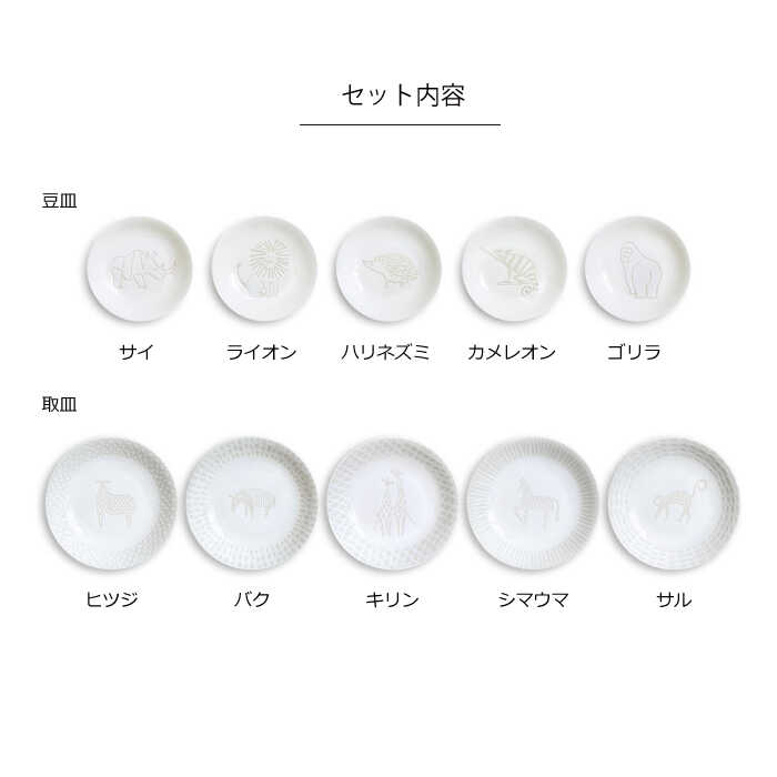 - 【ふるさと納税】 【 波佐見焼 】 ZUPA white 豆皿 5柄 ( サイ / ライオン / ハリネズミ / カメレオン / ゴリラ ) ・ 取皿 5柄 ( ヒツジ / バク / キリン / シマウマ / サル ) 計10点セット 食器 皿 【 natural69 】 [QA70]