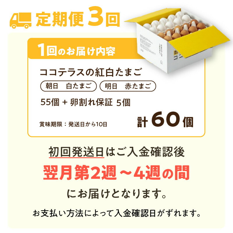 - 【ふるさと納税】【3ヵ月定期便】ココテラスの紅白たまご 55個 + 5個保証【計60個】【 JGAP認証 】農家直送 新鮮 卵 純植物性飼料 飼料にこだわった 卵かけご飯 米たまご 大容量 卵 定期 送料無料