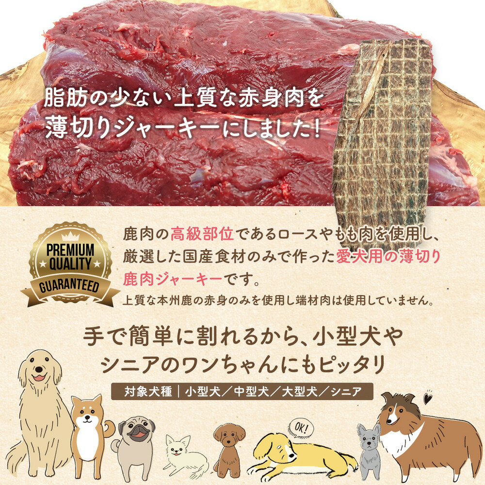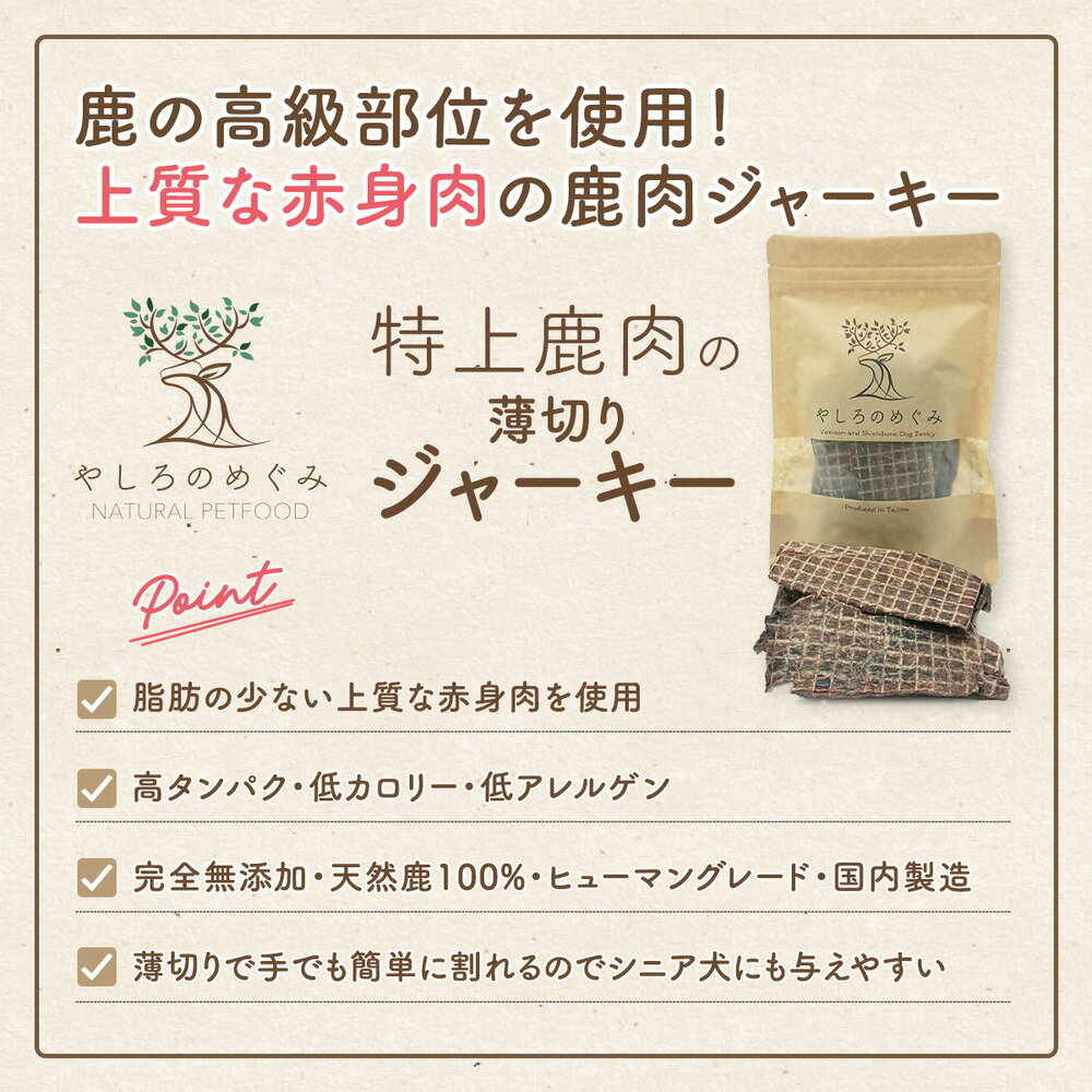 - 【ふるさと納税】特上鹿肉の薄切りジャーキー 50g / 鹿肉 ジャーキー 犬 薄切り 無添加 おやつ 小型犬 中型犬 大型犬 シニア 高タンパク 低カロリー 低アレルゲン 鉄分 DHA サクサク 軽い食感 手で割れる 高級部位 赤身のみ使用 国産 ペットフード 鹿肉専門店 やしろのめぐみ