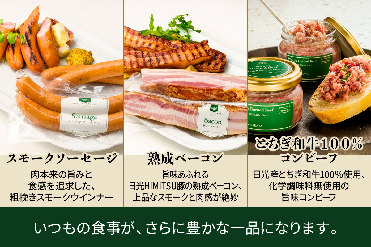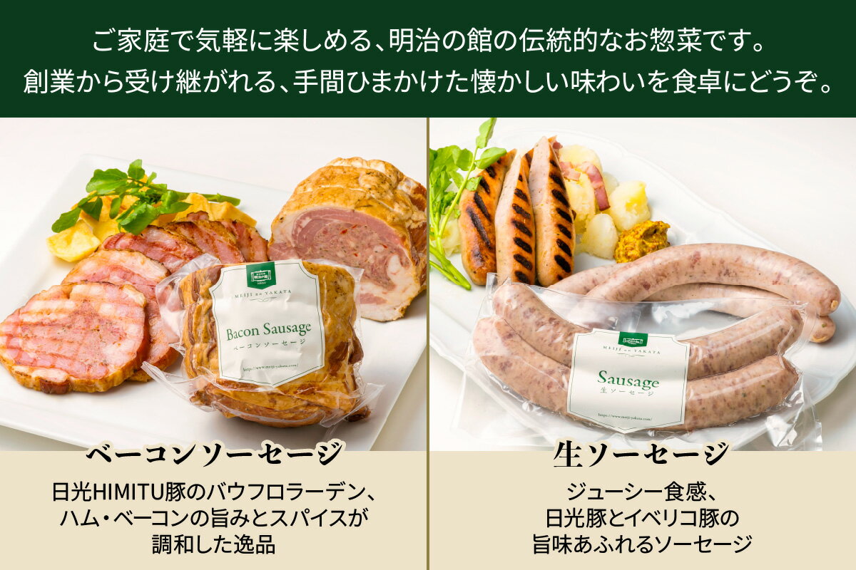 - 【ふるさと納税】明治の館 特製グルメセット5種 (ベーコンソーセージ、生ソーセージ、スモークソーセージ、熟成ベーコン、とちぎ和牛100%コンビーフ)|とちぎ和牛 日光ひみつ豚 ビーフ 牛肉 惣菜 おかず 洋食 アソート ギフト グルメ 簡単調理 冷凍保存 日光市 [0741]