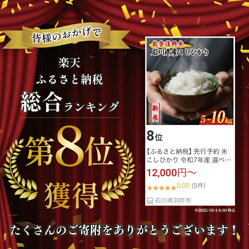 【ふるさと納税】 先行予約 米 こしひかり 令和7年産 選べる 精米 5kg 10kg 石川県産 能登復興米 単品 能登 米 減農 新米 予約 石川県産 エコ 栽培 白米 コメ お米 2025年産 おこめ 精米 ごはん コシヒカリ おいしい 令和7年 能登 石川県 羽咋 能登 復興支援