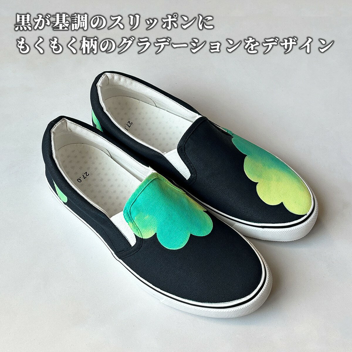 - 【ふるさと納税】スニーカー moku-surf D 手描きスリッポン 左右非対称デザイン 雲柄 グラデーション 黒地 アシンメトリー 大人可愛い おしゃれ おすすめ レディース メンズ ユニセックス ワイズ 2E 22.0~28.0cm【受注制作】