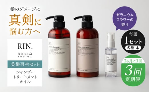 - 【全3回定期便】【2ヵ月に1回お届け】RIN. シャンプー・トリートメント・オイル(ゼラニウムフラワー) 3点 美髪再生セット【髪の悩みはこれで解決!】 大阪府高槻市/株式会社sodatu. [AOCK017]シャンプー トリートメント リンス 石鹸 せっけん セット 美容 シャンプー トリートメント リンス 石鹸 せっけん セット 美容