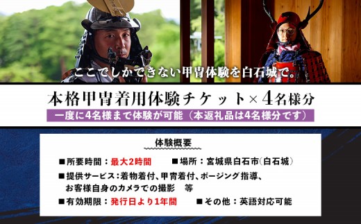 お城で体験! 本格甲冑着用体験チケット 1名様分×4枚 | お城 体験 甲冑体験 甲冑着用 本格甲冑 侍体験 戦国体験 歴史体験 観光チケット 観光体験 日本文化 和装体験 観光スポット 歴史好き ふるさと納税 お取り寄せ ワンストップ マイページ ビーアサムライ 白石市【440004】