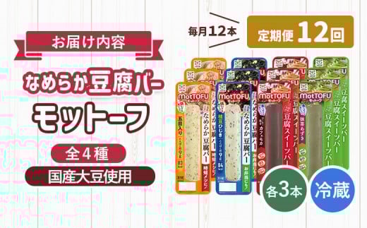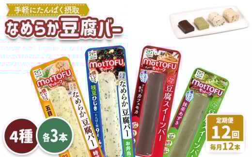 - 【定期便:12回】【たんぱく質】なめらか豆腐バー「モットーフ」全12本(4種×各3本) | 健康 豆腐バー 植物性タンパク質 タンパク質 植物性たんぱく質 お手軽 朝ごはん おやつ 間食 ヘルシー お取り寄せ 宮城県 白石市 白石【53022】