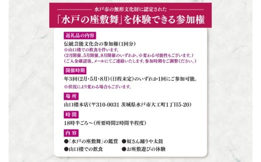 - 水戸市の無形文化財に認定された「水戸の座敷舞」を体験できる「伝統芸能文化会」参加権(NN-1)