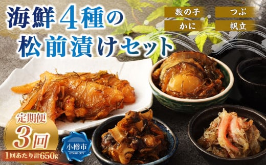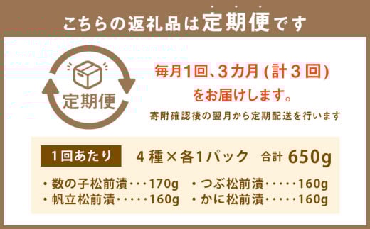 【3回定期便】 海鮮4種の松前漬けセット 合計650g 1回あたり 650g ×3回 合計 12パック(1.95kg)松前漬け 松前漬 数の子 カズノコ 帆立 ホタテ つぶ貝 かに 蟹 ずわい蟹 ズワイガニ