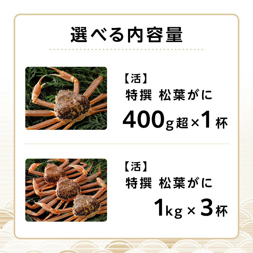 - 【ふるさと納税】内容量が選べる【活】≪2025年11月発送≫ 特撰 松葉がに【ブランドタグ付き】 400g超×1杯~1kg×3杯 | 松葉ガニ 松葉がに かに 蟹 鳥カニ味噌 みそ 鳥取県産 特撰 活 タグ付き 新鮮 鳥取県 北栄町 おすすめ 人気