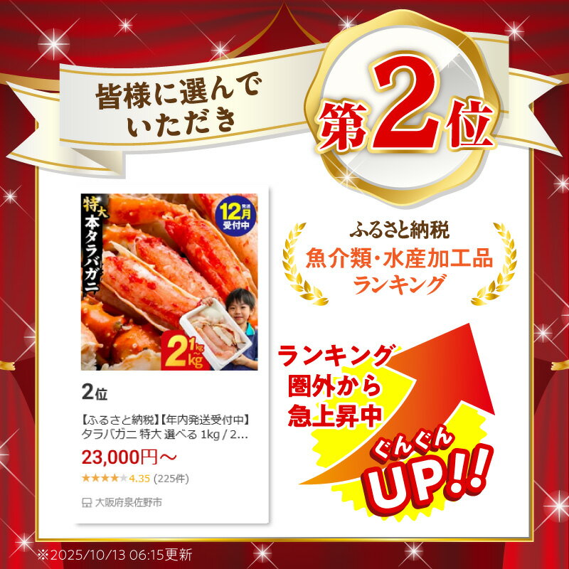- 【ふるさと納税】【年内発送受付中】タラバガニ 特大 選べる 1kg / 2kg 訳あり 規格外 サイズ不揃い ボイル済 脚 簡単 弾力 カニ鍋 焼きガニ カニ雑炊 魚介類 海の幸 海鮮 冷凍 ランキング急上昇中 発送月 大阪府 泉佐野市 送料無料