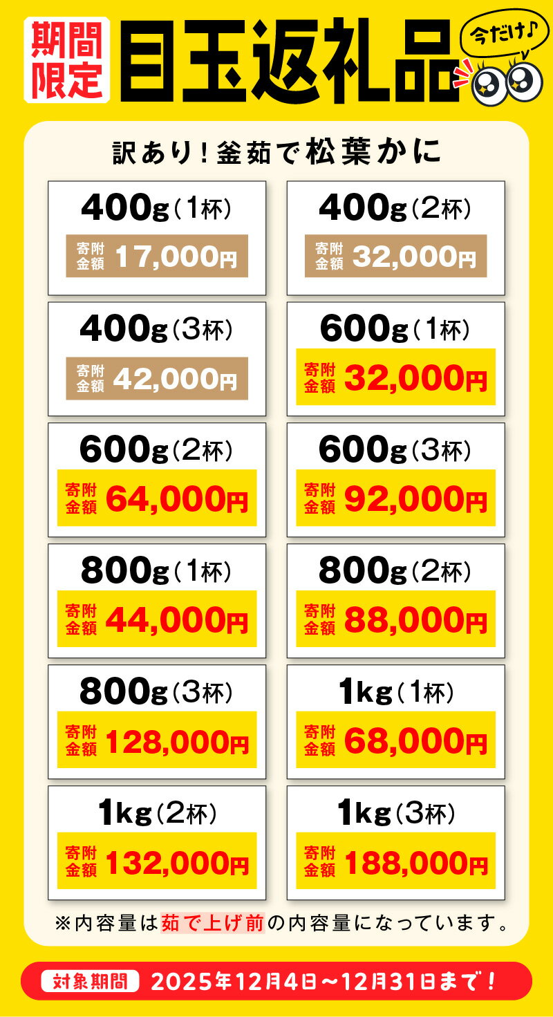- 【ふるさと納税】【訳あり!!タグ付きブランド】茹で松葉かに 鮮度抜群、釜茹でにてお届け!!(足1本落ち) 400g級 600g級 800g級 1kg級 1杯~3杯 選べる 内容量 数量 ふるさと納税 蟹 国産 かに ずわいがに 松葉かに 茹で ボイル