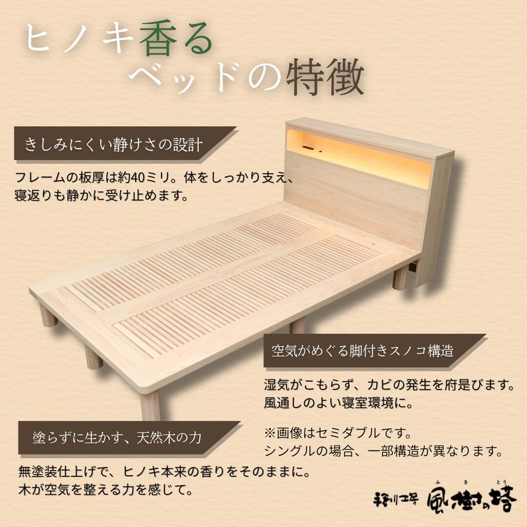 【ふるさと納税】 シングルベッド 宮付き 2口コンセント ライト ヒノキ香るベッド ベッドフレーム 桧 フレーム シングル 天然木 スノコ 無塗装 睡眠 安眠 消臭 調湿 抗菌 防虫 ダニ 疲労軽減 疲労回復 カビ 湿気 敷布団 可 コンセント ライト 風樹の塔 奈良県 奈良市 650-001
