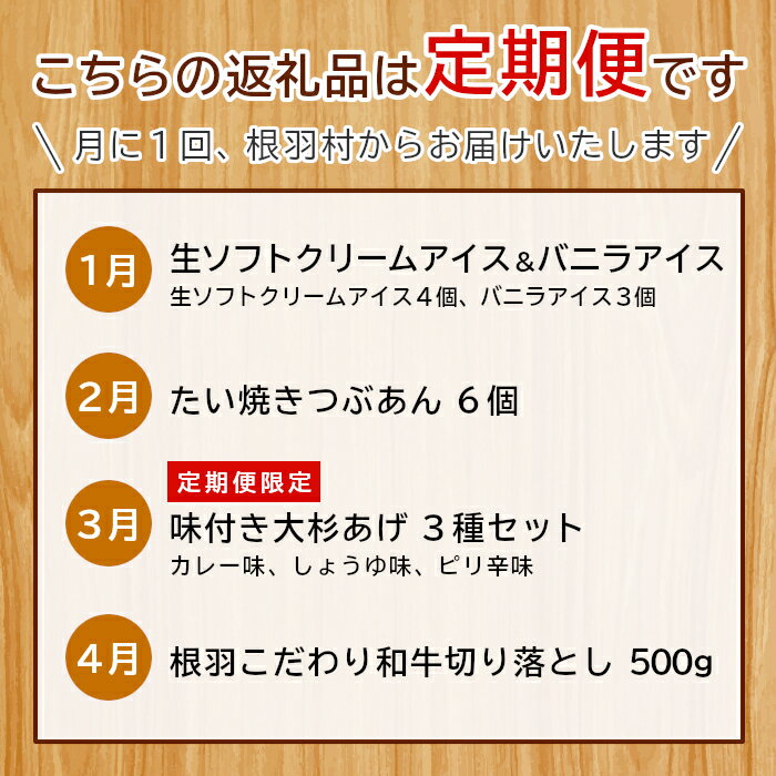 - 【ふるさと納税】全4回 人気の返礼品が大集合★ 人気 定期便 限定 黒毛和牛 切り落とし アイスクリーム たい焼き 味付け揚げ 揚げ カレー 醤油 牛 牛肉 和牛 粒あん つぶ バニラ ミルク おつまみ おかず 20000円 20,000円 2万