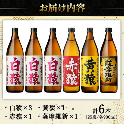 No.110 焼酎5合飲み比べセット(900ml×6本) 焼酎 酒 薩摩 5合 芋焼酎 麦焼酎 芋 麦 麹 赤猿 黄猿 薩摩維新 白猿 アルコール 飲み比べ ギフト 贈答 鹿児島限定 常温【小正醸造】