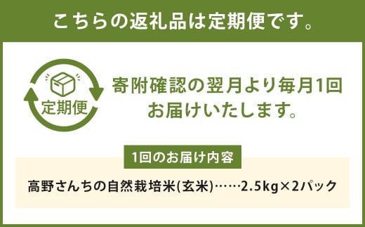 【真空パック】【定期便3ヶ月】七城物語 高野さんちの 自然栽培米 (玄米) 5kg (2.5kg×2パック) 合計15kg お米 米 玄米 ヒノヒカリ