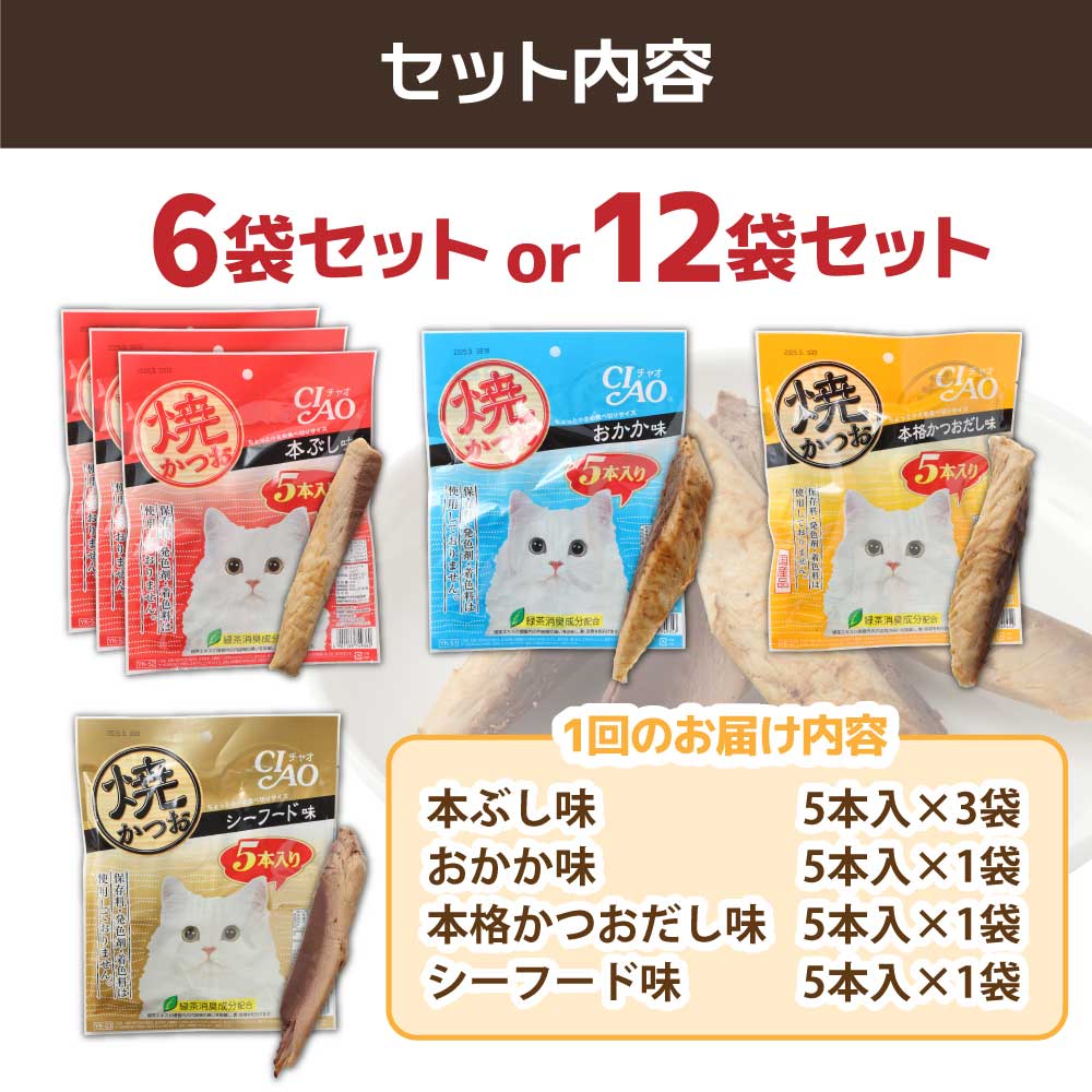 - 【ふるさと納税】キャットフード パウチ 無添加 ペットフード いなば チャオ 焼かつお 全4風味 5本入×6~12袋セット 選べる 単品 定期便 猫 ねこ ネコ スティックタイプ 消臭 カツオ 魚肉 ごはん ペット用品 猫の餌 おやつ ご褒美 安心 国産品 常温 土佐清水市 【R00273】