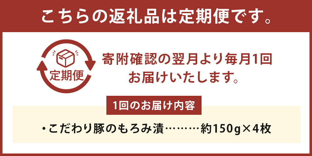 - 【ふるさと納税】<選べる定期便>こだわり豚のもろみ漬 1回あたり計約600g(約150g×4枚入り) 1ヶ月毎 3回 6回 豚肉 お肉 ロース肉 味付き もろみ味噌 もろみみそ 惣菜 おかず ご飯のお供 ごはんのお供 冷凍 国産 九州 熊本県 人吉市 送料無料