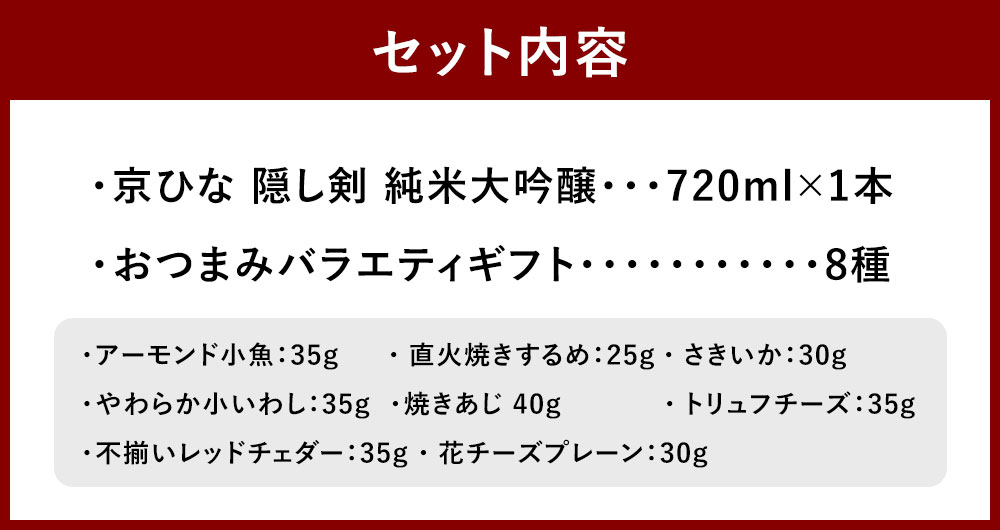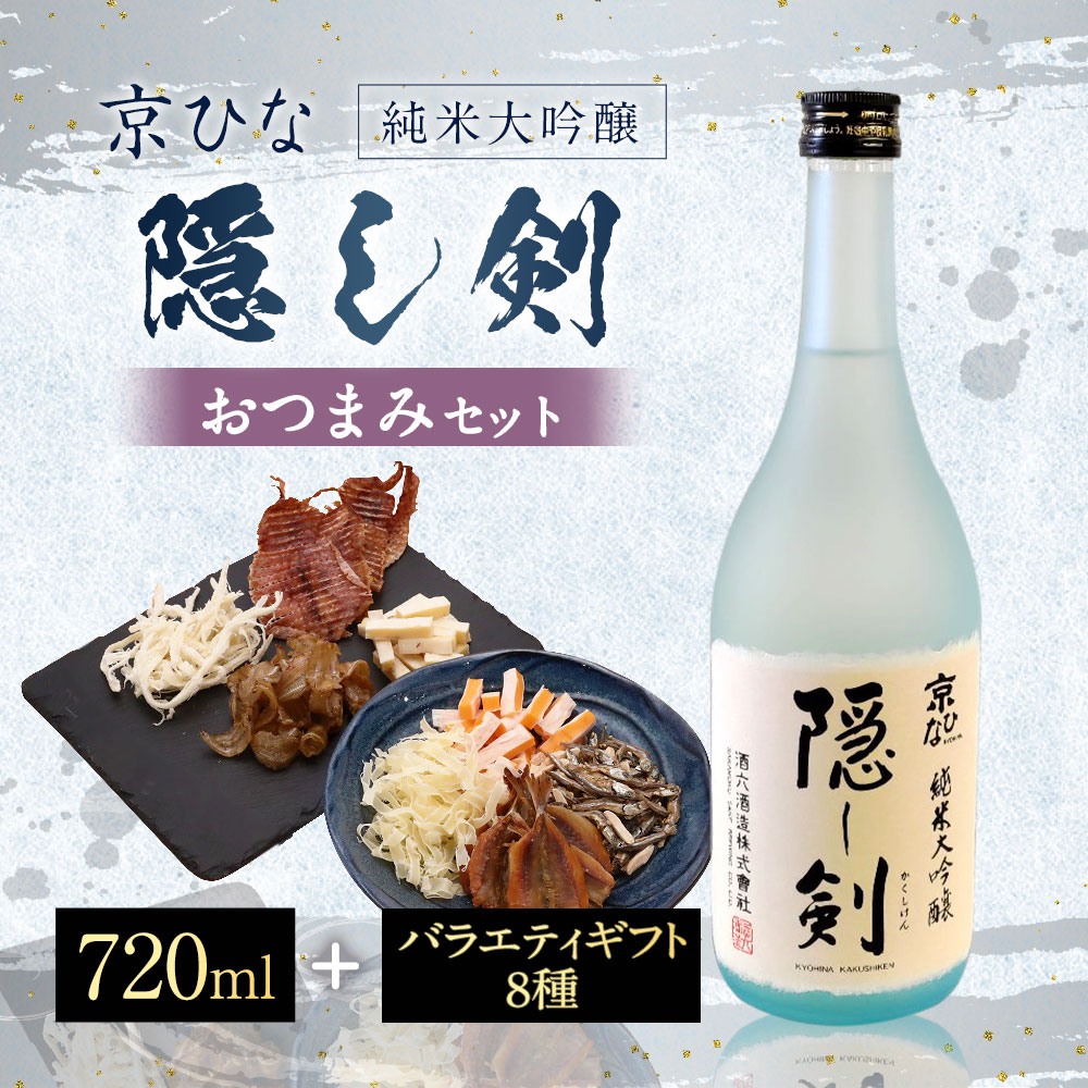 - 【ふるさと納税】京ひな 隠し剣 純米大吟醸 720ml×1本 おつまみセット(バラエティギフト8点セット) アーモンド小魚 するめ 小いわし 焼きあじ さきいか レッドチェダー チーズプレーン トリュフチーズ 酒 お酒のお供 【えひめの町(超)推し!】 愛媛県 送料無料 (602)