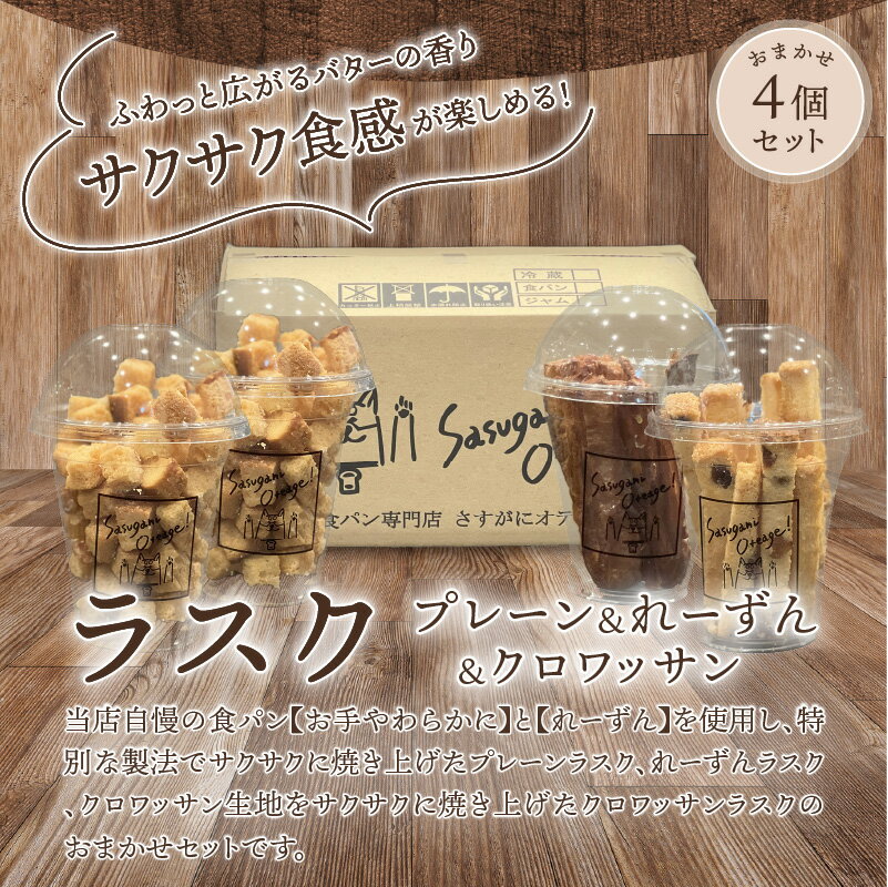 - 【ふるさと納税】ラスク おまかせ 4個 セット プレーン れーずん クロワッサン 3種類からおまかせ 自慢の食パン使用 サクサク バターの豊かな風味 シンプル 深い味わい おやつ お菓子 洋菓子 スイーツ 焼き菓子 お取り寄せ お取り寄せスイーツ 滋賀県 守山市 送料無料