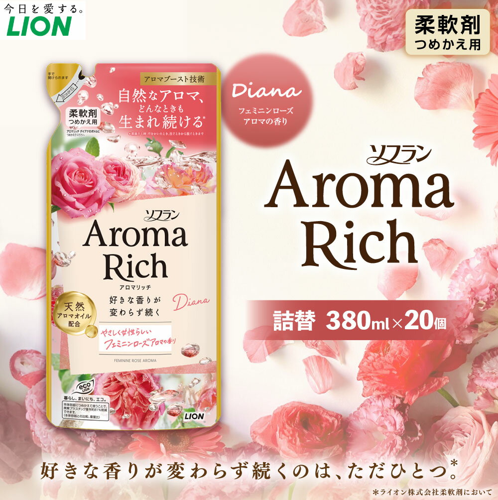 【ふるさと納税】ソフランアロマリッチダイアナ つめかえ 計7600ml(380ml×20個) 詰め替え 詰替え キレイトリートメント柔軟剤 フェミニンローズアロマの香り 天然ゼラニウムオイル配合 洗濯洗剤 石鹼 日用品 消耗品 洗浄 衣類 衣料 茨城県 神栖市 送料無料
