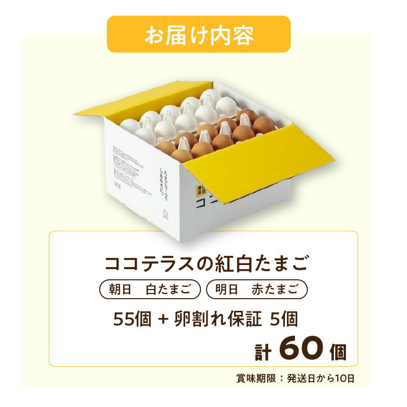 - 【ふるさと納税】ココテラスの 紅白たまご 55個 + 5個保証【計60個】【 JGAP認証 】農家直送 新鮮 卵 純植物性飼料 飼料にこだわった 卵かけご飯 米たまご 白卵 赤卵 大容量 送料無料