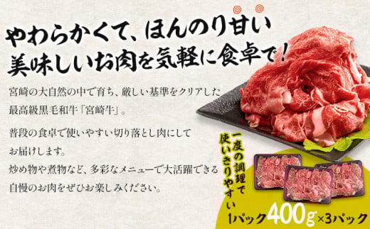 【訳あり】宮崎牛 こま切れ 計1.2kg(400g×3パック) すき焼き すきやき 鍋 鍋料理 煮込み 炒め 炒め物 お弁当 おかず 肉じゃが 焼き肉 BBQ バーベキュー 家庭用 自宅用 訳あり肉 訳あり品 アレンジ 400g 3パック 小分け パック 肉 お肉 不揃い 和牛 食品 牛肉 赤身 ジューシー プレミアム 形 大きさ コマ切れ 切り落とし 細切れ 宮崎県 宮崎市_M155-015