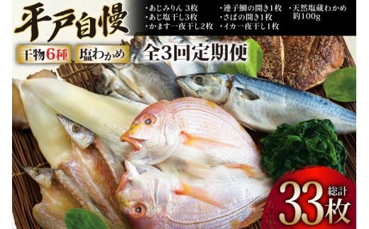 - 干物 平戸 豪華 6種 詰合せ & 天然 塩わかめ セット 11枚 3回 定期便 総計 33枚 食べ比べ [一山水産 長崎県 平戸市 hr42bgy400124] あじ アジ さば サバ いか イカ タイ 鯛 ワカメ 国産 おかず