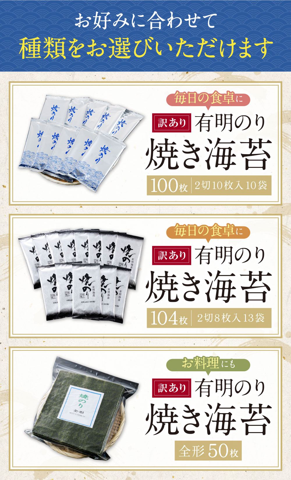 - 【ふるさと納税】種類選べる 訳あり 有明海産 焼き海苔 50~104枚 50枚 100枚 104枚 2切 全形 個包装 袋入り 便利 有明海苔 手巻き寿司 ご飯のお供 わけあり ワケアリ 訳アリ 福岡県 福智町 送料無料