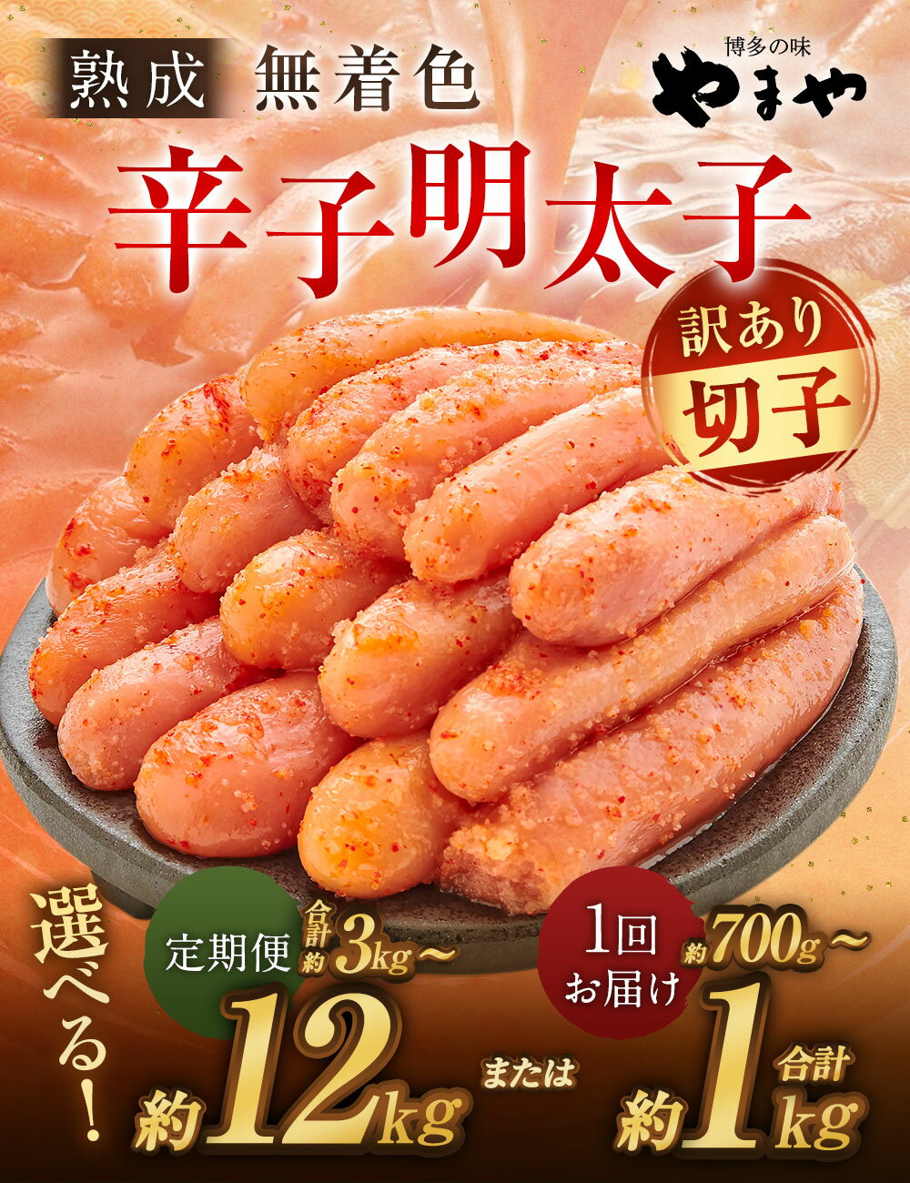 【ふるさと納税】<選べる定期便・内容量>【訳あり】やまや 熟成無着色明太子 切子 単品・定期便 3回 4回 6回 12回 計700g(350g×2)・計1kg(500g×2)12000円 1万2000円 家庭用 辛子明太子 めんたいこ 切れ子 魚卵 魚介類 冷凍 福岡県 直方市