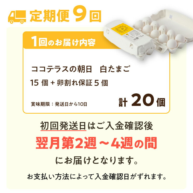 - 【ふるさと納税】【9ヵ月定期便】ココテラスの朝日( 白たまご )15個 + 5個保証【計20個】【 JGAP認証 】農家直送 新鮮 卵 純植物性飼料 飼料にこだわった 卵かけご飯 米たまご 大容量 卵 定期 送料無料