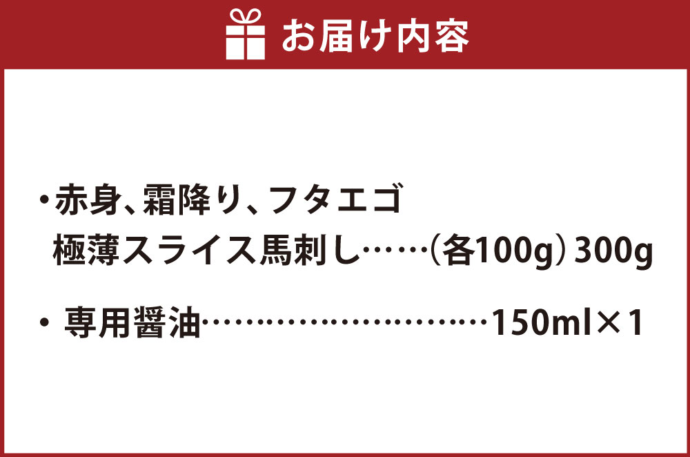 - 【ふるさと納税】【桜屋】新感覚!極薄スライス 「花びら馬刺し」 3種盛り 赤身・霜降り・フタエゴ 計300g(各100g×3) 専用醤油付き:150ml×1本 馬肉 お肉 馬刺 人気部位 詰め合わせ セット しょうゆ 冷凍 熊本県 熊本市 送料無料