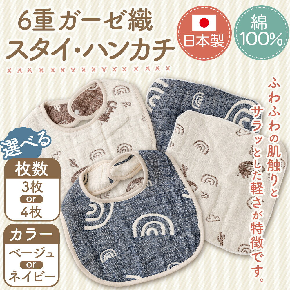 【ふるさと納税】【選べる カラー ・枚数】 6重ガーゼ織スタイ + ガーゼ織ハンカチ ( 1枚 / 2枚 ) ベージュ / ネイビー 綿 コットン 綿100% ハンカチ 泉州タオル 生活用品 日本製 大阪泉州 大阪府 阪南市 送料無料