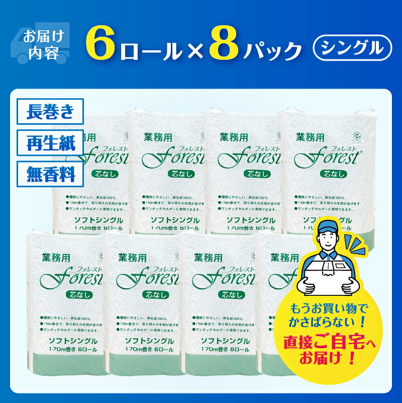 【ふるさと納税】 144ロール相当 3倍巻 トイレットペーパー フォレスト シングル 48ロール(6R×8) 無香 再生紙100% 芯なし 長巻 取り換え頻度軽減 省スペース エコ 防災 備蓄 日用品 生活用品 生活必需品 消耗品 富士市 [sf112-002]
