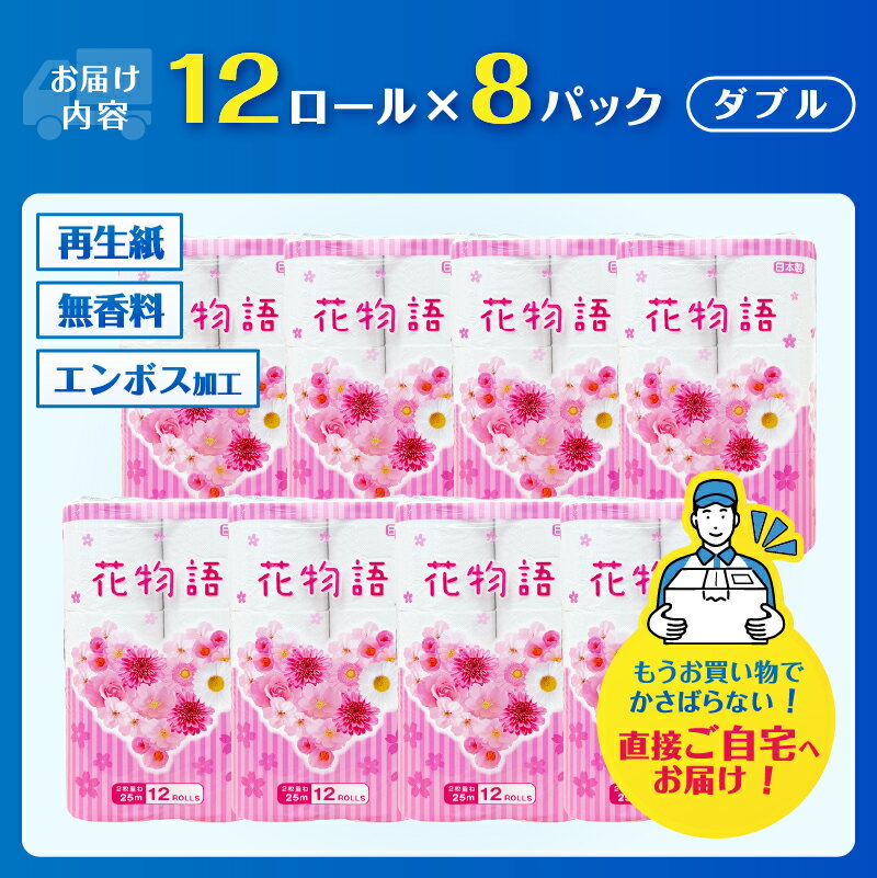 - 【ふるさと納税】 トイレットペーパー 花物語ダブル 96ロール (12R×8パック) 無香料 再生紙100% リーフ模様 エンボス加工 防災 備蓄 日用品 生活用品 生活必需品 消耗品 富士市 [sf112-003]