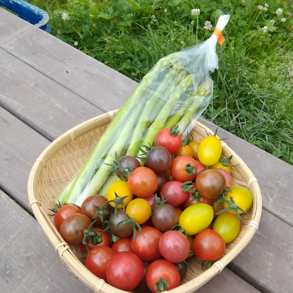 - <2026年7月上旬よりお届け>北海道壮瞥町産 大作農園「夏アスパラとカラフルミニトマト」のセット約1kg 先行予約 SBTR004