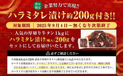 - 塩味 訳あり厚切り牛タン(軟化加工) 1kg+ハラミタレ漬け200gセット 【2025年12月発送】【軟化加工】外国産 厚切り 牛タン 肉 BBQ 焼肉 熊本県 水上村