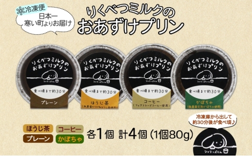 - 北海道 十勝 りくべつミルク おあずけプリン 4種 プレーン かぼちゃ ほうじ茶 コーヒー 80g 各1個 計4個 プリン 冷凍プリン デザート おやつ ギフト 冷凍