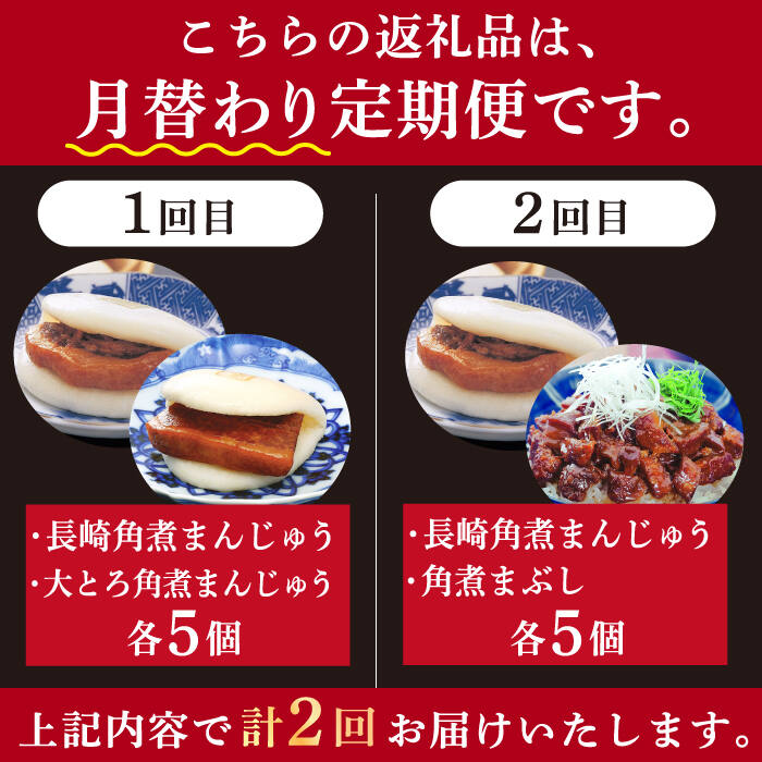 - 【ふるさと納税】【2回定期便】<月替り!> 長崎角煮まんじゅう+大とろ角煮まんじゅう(各5個)・長崎角煮まんじゅう+角煮まぶし(各5個)≪小値賀町≫ 角煮 冷凍【岩崎食品】[DBG070]