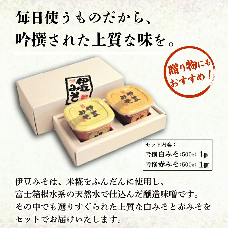 - 【ふるさと納税】 吟撰みそ 計 1kg 味噌 調味料 厳選 米 大豆 発酵食品 麹 和食 伝統 醸造 保存食 吟撰白みそ 500g 1個 吟撰赤みそ 500g 1個 セット 伊豆フェルメンテ 贈り物 ギフト 発酵 うまみ 栄養 手作り 伝統食 旨味 こだわり 素材 三島市 静岡県