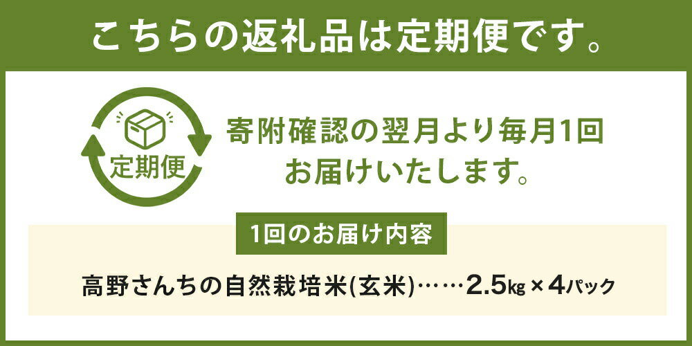 - 【ふるさと納税】【選べる定期便】熊本県菊池産 ヒノヒカリ 玄米 10kg 3ヶ月/6ヶ月/12ヶ月 定期便 七城物語 高野さんちの自然栽培米 米 お米 自然栽培米 特A 国産 九州産 熊本県産 送料無料